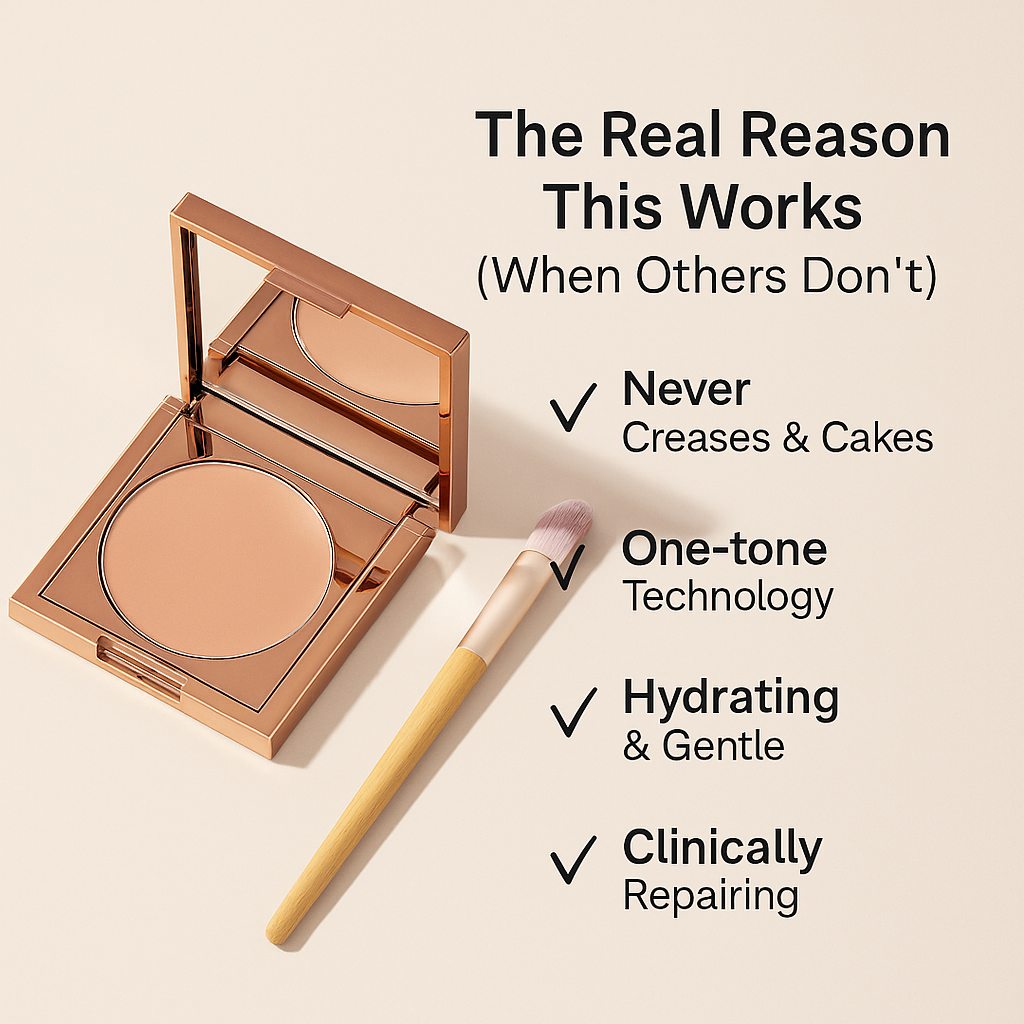 A patented rose-yellow-lavender blend that neutralizes all tones of darkness — no guessing, no mismatches.